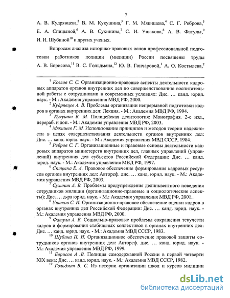 Вопросам анализа историко-правовых основ профессиональной подготовки работников полиции (милиции) России посвящены труды А. В. Борисова,11 В. С. Гольдмана,12 Ю. В. Гончаровой,1 А. О. Костылева,2