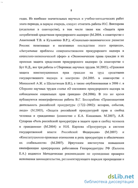 годах. Из наиболее значительных научных и учебно-методических работ этого периода, в первую очередь, следует отметить работы И.С. Викторова (отдельные в соавторстве), в том числе такие как «Защита прав потребителей средствами прокурорского надзора» (М.2004. в соавторстве с Ашитковой Т.В. и Кузьменко В.Р.); «Социально-экономическое развитие России: позитивные и негативные последствия этого процесса», «Актуальные проблемы совершенствования прокурорского надзора в социально-экономической сфере» и «Экономические права граждан и их правовая защита средствами прокурорского надзора» (в соавторстве с Бут Н.Д., все три работы в Сборниках научных трудов. М.2005); «Правовая защита конституционных прав граждан на труд средствами государственного надзора и контроля» (М.2005. в соавторстве с Макашевой А.Ж. и Шалыгиным Б.И.), а также опубликованная в 2006 г. в Сборнике научных трудов статья «О состоянии прокурорского надзора за соблюдением социальных прав граждан» (М.2006). В это же время публикуются монографические работы В.Г. Бессарабова «Правозащитная деятельность российской прокуратуры (1722-2002): история, события, люди» (М.2003), «Защита российской прокуратурой прав и свобод человека и гражданина» (совместно с К.А. Катаевым. М.2007), А.Я. Сухарева «Роль российской прокуратуры в защите прав и свобод человека и гражданина» (М.2004) и Н.Н. Карпова «Прокуратура в системе государственной власти Российской Федерации» (М.2007) и «Конституционно-правовые отношения и роль прокуратуры в обеспечении их стабильности» (М.2007). Иркутским институтом повышения квалификации прокурорских работников Генпрокуратуры РФ (Евлоева Е.А.) издаются Методические рекомендации по проведению проверки исполнения законодательства, регламентирующего порядок прекращения и