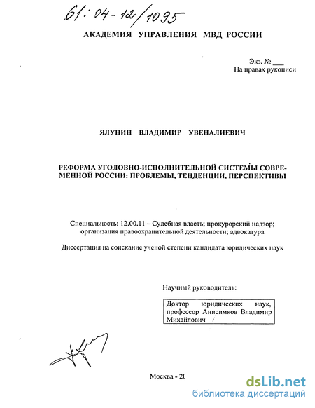 связанных элементов, поэтому изменение одного из них (исправительные учреждения, учреждения, исполняющие наказания без изоляции от общества, кадры и т.п.), предполагает соответствующие новые подходы к организации функционирования других ее составляющих элементов (аппараты управления, ресурсное и правовое обеспечение). Научное обоснование комплексного иод-хода к проведению реформы УИС позволит повысить ее практическую отдачу и эффективность конечного результата.