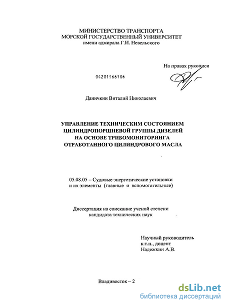 Реализация работы. Результаты исследований внедрены и используются на судах ОАО «Приморское морское пароходство» (ОАО «ПМП») и других судоходных компаний Дальневосточного бассейна для управления техническим состоянием ЦПГ главных дизелей. Основные положения работы применяются в учебном процессе МГУ им. адм. Г.И. Невельского при чтении курса «Технология использования топлив и смазочных материалов на судах».
