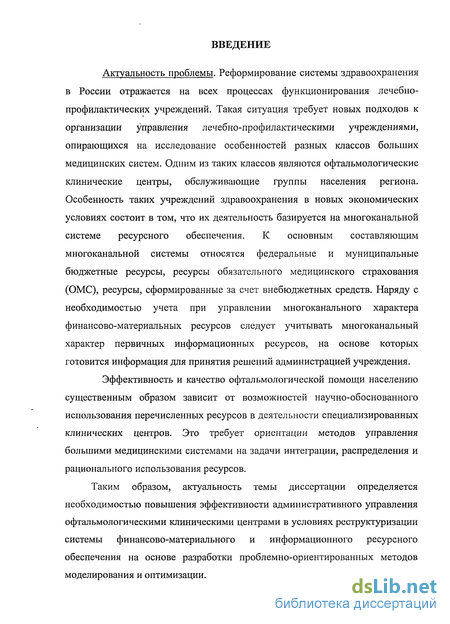 Таким образом, актуальность темы диссертации определяется необходимостью повышения эффективности административного управления офтальмологическими клиническими центрами в условиях реструктуризации системы финансово-материального и информационного ресурсного обеспечения на основе разработки проблемно-ориентированных методов моделирования и оптимизации.
