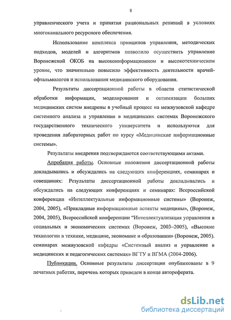 Апробация работы. Основные положения диссертационной работы докладывались и обсуждались на следующих конференциях, семинарах и совещаниях: Результаты диссертационной работы докладывались и обсуждались на следующих конференциях и семинарах: Всероссийской конференции «Интеллектуальные информационные системы» (Воронеж, 2004, 2005), «Прикладные информационные аспекты медицины», (Воронеж, 2004, 2005), Всероссийской конференции "Интеллектуализация управления в социальных и экономических системах (Воронеж, 2003-2005), «Высокие технологии в технике, медицине, экономике и образовании» (Воронеж, 2005). семинарах межвузовской кафедры «Системный анализ и управление в медицинских и педагогических системах» ВГТУ и ВГМА (2004-2006).