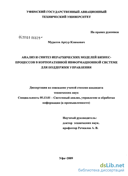 Диссертация является результатом исследований проводимых на кафедре АСУ УГАТУ по проблемам разработки методологии системного моделирования бизнес-процессов для крупных промышленных предприятий.