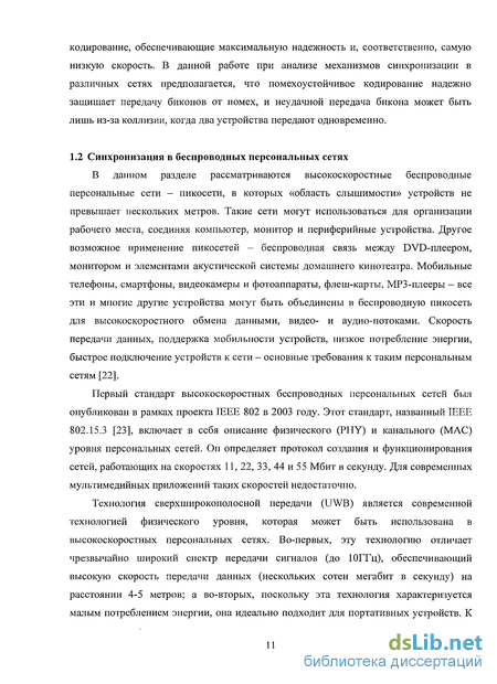 Позднее в комитете по стандартам IEEE была образована группа 802.15.5, которая разрабатывает рекомендации построения беспроводных персональных mesh- сетей, во многом заимствуя идеи ЕСМА 368, в том числе и распределенный механизм синхронизации устройств. На момент написания диссертации стандарт 802.15.5 далек от завершения, поэтому в данной диссертации в качестве примера беспроводных персональных сетей исследуются сети стандарта ЕСМА 368 (WiMedia). Названия ЕСМА 368 и WiMedia используются в литературе в равной степени часто. В данной работе преимущественно используется название WiMedia.