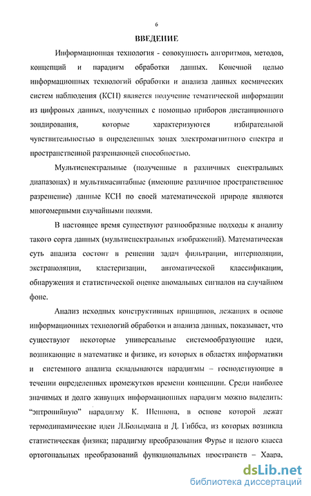 Информационная технология - совокупность алгоритмов, методов, концепций и парадигм обработки данных. Конечной целью информационных технологий обработки и анализа данных космических систем наблюдения (KCII) является получение тематической информации из цифровых данных, полученных с помощью приборов дистанционного зондирования, которые характеризуются избирательной чувствительностью в определенных зонах электромагнитного спектра и пространственной разрешающей способностью.