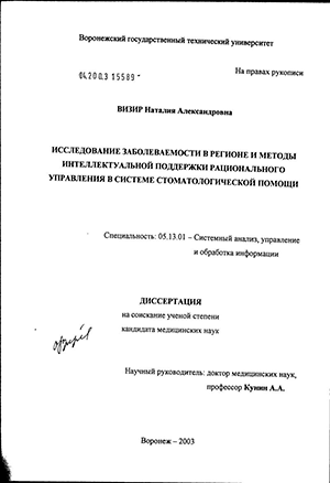 Визир Наталия Александровна. Исследование заболеваемости в регионе и методы интеллектуальной поддержки рационального управления в системе стоматологической помощи : диссертация ... кандидата медицинских наук : 05.13.01 / Визир Наталия Александровна; [Место защиты: Воронежский государственный технический университет].- Воронеж, 2003.- 118 с.: ил.