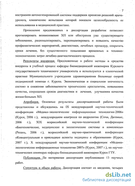 Результаты внедрения. Предложенные в работе методы и средства внедрены в учебный процесс кафедры биомедицинской инженерии Курского государственного технического университета и используются в клинической практике Муниципального учреждения здравоохранения больницы скорой медицинской помощи? г. Курска. Экономическая и социальная значимость состоит в снижении заболеваемости хроническим простатитом, повышении качества, сокращении, сроков диагностики и лечения; улучшении качества жизни больных ХП.