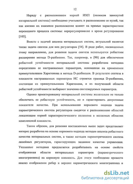 В основу разработки таких методов предлагается положить корневой подход, использующий законы миграции корней характеристических полиномов интервальных систем [94-98]. При корневом подходе понятие региональной робастной устойчивости связано с различными вариантами расположения корней ИХП, соответствующими определенным сочетаниям интервальных параметров. При проектировании интервальной системы на основе корневого подхода основная задача состоит в обеспечении желаемого качества её функционирования при любых возможных значениях интервальных параметров, которое достигается гарантированным . расположением корней в желаемой области.