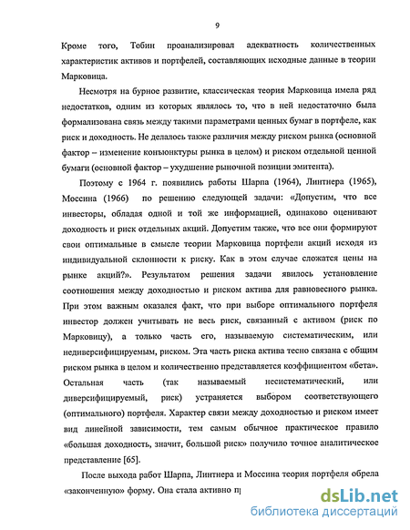 Влияние «портфельной теории» Марковица значительно усилилось после появления в конце 50-х и начале 60-х гг. работ Д. Тобина [10]. В отличие от Марковица он акцентирует внимание на поведении отдельного инвестора, формирующего оптимальный, с его точки зрения, портфель на основе собственной оценки доходности и риска выбираемых активов. Тобин также предложил включить в анализ безрисковые активы. Акцент в работах Марковица делался не на экономическом анализе исходных постулатов теории, а на математическом анализе их следствий и разработке алгоритмов решений оптимизационных задач. В подходе Тобина основной темой становится анализ факторов, заставляющих инвесторов формировать портфели активов, а не держать капитал в какой-либо одной, например налично-денежной, форме. Кроме того, Тобин проанализировал адекватность количественных характеристик активов и портфелей, составляющих исходные данные в теории Марковича.