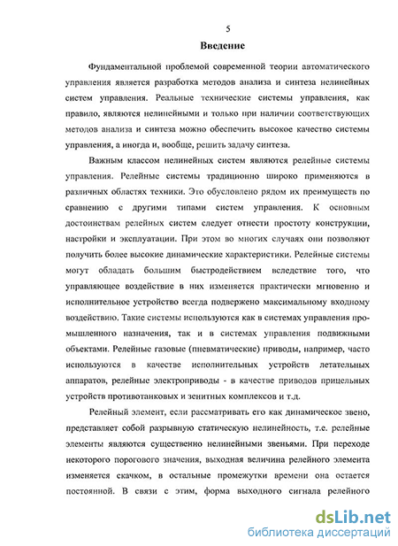 Актуальность темы. Современная теория автоматического управления имеет достаточное количество эффективных инструментов анализа и синтеза линейных систем управления. Результаты, полученные в нелинейной теории, имеют, как правило, частный характер и относятся к определенному классу нелинейно-стей. В настоящее время фундаментальной проблемой теории управления является разработка методов анализа и синтеза новых важных и более широких классов нелинейных систем. Одним из таких классов являются релейные системы управления. Эти системы традиционно широко применяются в различных областях техники, что обусловлено рядом их преимуществ по сравнению с другими типами систем управления. К основным достоинствам релейных систем следует отнести простоту конструкции, настройки и эксплуатации. При этом во многих случаях они позволяют получить более высокие динамические характеристики. Релейные системы могут обладать большим быстродействием вследствие того, что управляющий сигнал в них изменяется практически мгновенно и объект управления всегда подвержен максимальному управляющему воздействию. Одной из характерных особенностей релейных систем является их склонность к автоколебаниям. Такой режим часто используется в качестве рабочего. Именно наличие автоколебаний позволяет добиваться нечувствительности системы к воздействию многих внешних возмущений, устранять вредное влияние отдельных нелинейных характеристик объекта управления.