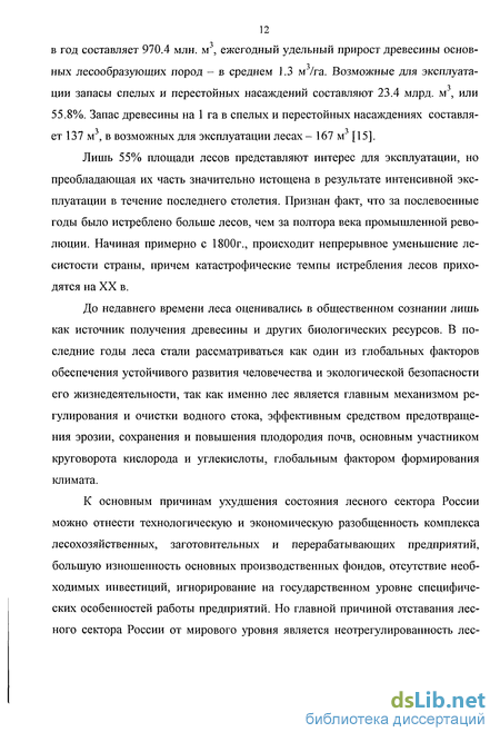 К основным причинам ухудшения состояния лесного сектора России можно отнести технологическую и экономическую разобщенность комплекса лесохозяйственных, заготовительных и перерабатывающих предприятий, большую изношенность основных производственных фондов, отсутствие необходимых инвестиций, игнорирование на государственном уровне специфических особенностей работы предприятий. Но главной причиной отставания лесного сектора России от мирового уровня является неотрегулированность лес 13 ных отношений, отсутствие в стране долговременной национальной лесной политики.