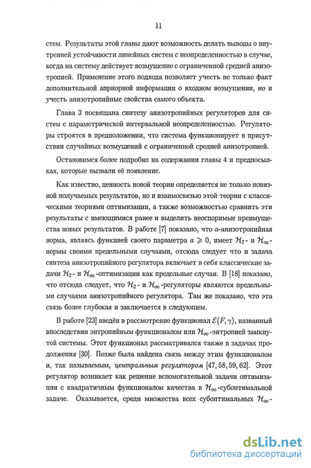 Изложение диссертационной работы построено следующим образом. В главе 1 дано краткое изложение анизотропийного анализа линейных систем управления. Эти результаты известны и поэтому приводятся в обзорной форме, без доказательств с указанием ссылок на первоисточники.