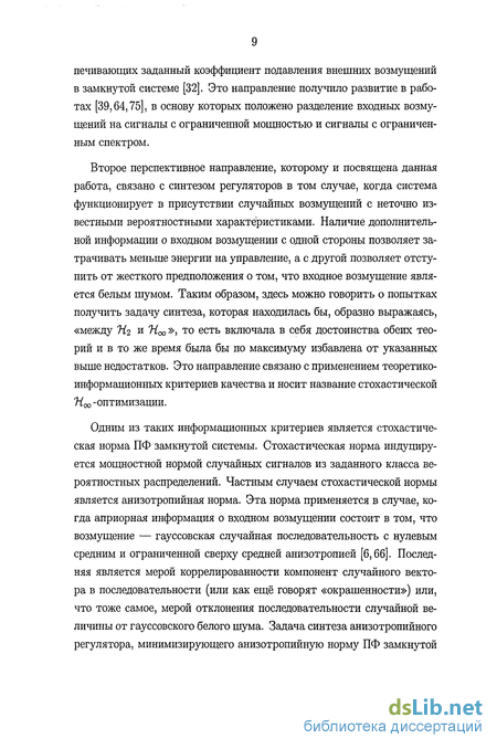 печивающих заданный коэффициент подавления внешних возмущений в замкнутой системе [32]. Это направление получило развитие в работах [39,64,75], в основу которых положено разделение входных возмущений на сигналы с ограниченной мощностью и сигналы с ограниченным спектром.