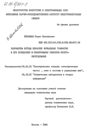 Рассмотрены различные методы решения переборных задач с точки зрения их эффективности и применимости к задаче планирования ремонтов энергооборудования электростанций. Далее описана математическая модель, введенная автором (метод иерархии формальных грамматик), рассмотрены формальные языки траекторий, зон и переводов и порождающие их грамматики. Доказаны теоремы о свойствах этих языков, существенных для применения метода. Проведен анализ существующей практики организации и планирования планово-предупредительных ремонтов энергооборудования. Далее с учетом проведенного анализа описано применение нового метода в задаче месячного планирования ремонтов (алгоритм ПИОНЕР-2).