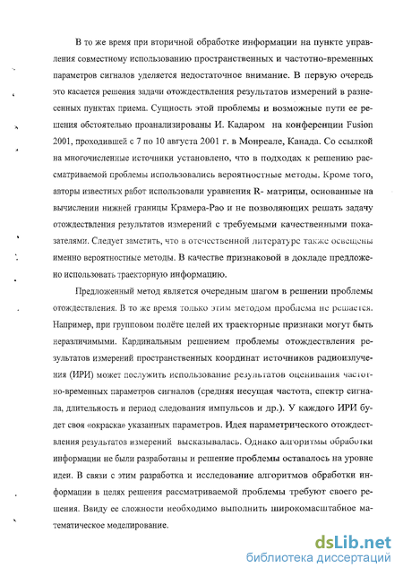 Актуальность темы. Среди комплекса задач, возлагаемых на средства контроля воздушно-космического пространства, распознавание объектов по их координатным и некоординатным признакам и обработка получаемой информации представляют собой одну из сложных и актуальных научно-технических проблем. Решение этой проблемы осуществляется на основе применения информационных средств радио- и оптического диапазонов длин волн. Так, для контроля космического, пространства создан специальный радиооптический комплекс, содержащий активные радиолокационные и оптико-электронные информационные средства. Для решения задачи контроля воздушного пространства наряду с активными применяют автономные и многопозиционные системы пассивной локации (МСПЛ).
