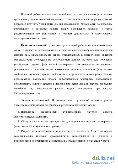 Цель исследований. Целью диссертационной работы является повышение качества обработки экспериментальных данных с помощью фрактальных методов анализа временных рядов на основе предложенных геометрических индексов фрактальности; исследование возможностей данных методов для получения устойчивых оценок фрактальной размерности по относительно коротким реализациям и решения задачи нахождения момента изменения фрактальных свойств наблюдаемых процессов; на основе теоретических и экспериментальных исследований выявление новых информативных критериев, позволяющих обнаруживать наличие дефекта в изделии при использовании метода свободных колебаний и позволяющих решать задачу диагностики при анализе биомедицинских данных.