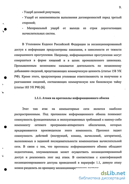 Несанкционированный доступ в локальную сеть, возможен в случае подключения сети к открытым сетям, например к сети Интернет. Злоумышленник использует программное обеспечение, предназначенное для осуществления различных типов атак находясь при этом за пределами локальной сети, т.е., осуществляя логический несанкционированный доступ [17,24]. При этом обобщенный алгоритм подготовки и реализации несанкционированного доступа имеет следующий вид: 1. Анализ структуры и принципов функционирования атакуемой компьютерной сети. Целью этого шага алгоритма является определение возможных уязвимостей компьютерной сети. 2. Анализ найденных уязвимостей и определение возможных способов выполнения атак. 3. Выполнение подготовленных атак и оценка полученных результатов. 4. Анализируются полученные результаты, принимается решение о прекращении несанкционированного доступа или его продолжении, т.е., переход к первому шагу алгоритма. Если реализация атак пройдет успешно, то злоумышленник нанесет ущерб владельцу информации, которая передается по каналам связи или хранится в вычислительных системах. Рассмотрим и классифицируем основные виды ущерба: - Моральный и материальный ущерб организациям и частным лицам, вызванный разглашением конфиденциальной информации; 9. - Ущерб деловой репутации; - Ущерб от невозможности выполнения договоренностей перед третьей стороной; Материальный ущерб от выхода из строя дорогостоящих вычислительных систем.