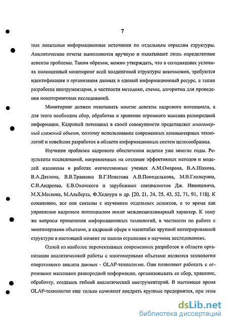 Изучение проблемы кадрового обеспечения ведется уже многие годы. Результаты исследований, направленных на создание эффективных методов и моделей изложены в работах отечественных ученых А.М.Омарова, В.А.Шахова, В.А.Дятлова, В.В.Травкина В.Г.Игнатова А.В.Понеделькова, М.В.Глазырина, С.ВАндреева, Е.В.Охотского и зарубежных специалистов Дж. Иванцевича, М.Х.Мескона, М.Альберта, Ф.Хедоури и др. [20, 21, 24, 25, 43, 52, 71, 91, 118]. К сожалению, все они связаны с изучением отдельных аспектов, в то время как управление кадровым потенциалом носит междисциплинарный характер. К тому же вопросы применения информационных технологий, в частности по работе с многомерными объетами, в кадровой сфере в масштабах крупной интегрированной структуры в настоящий момент не нашли отражения в научных исследованиях.
