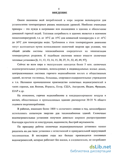 Актуальность проблемы. Около половины всей потребляемой в мире энергии используется для установления температурных разниц нескольких уровней. Наиболее очевидные примеры - это нужда в нагревании или охлаждении в зданиях и обеспечение домашней горячей водой. Тепловая потребность в зданиях является в основном низкотемпературной, т.е. от 20 С до 23 С для комнатной температуры и от 40 С до 50 С для температуры воды. Требования в этом температурном диапазоне могут выполняться путем использования солнечной энергии при условии, что общий дизайн системы теплоснабжения сосредоточен на минимизации температурных разрывов. К подобным системам можно отнести солнечные тепловые коллекторы.