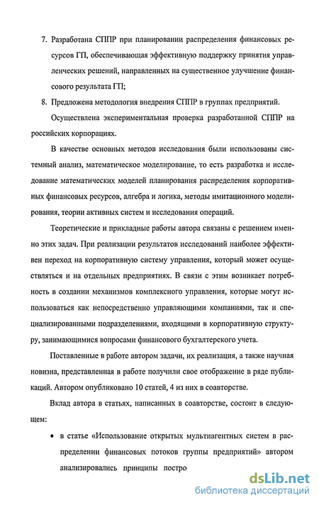 В качестве основных методов исследования были использованы системный анализ, математическое моделирование, то есть разработка и исследование математических моделей планирования распределения корпоративных финансовых ресурсов, алгебра и логика, методы имитационного моделирования, теории активных систем и исследования операций.