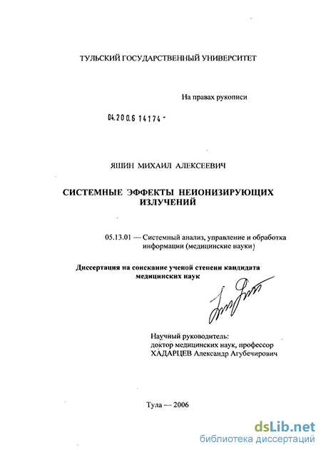 Яшин Михаил Алексеевич. Системные эффекты неионизирующих излучений [Электронный ресурс] : Диссертация ... кандидата медицинских наук : 05.13.01