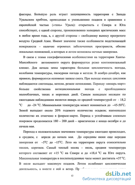 Территория Ханты-Мансийского автономного округа-Югры расположена в центре Западно - Сибирской равнины. Рельеф большей части плоский, с абсолютными отметками высот 36 - 55 мБС и перепадами высот 1 - 5 м, он оказывает большое влияние на сезонный температурный режим. Территория имеет развитую гидрографическую сеть. Реки и ручьи берут свое начало из болот. Продолжительность.срока стояния паводковых вод на реках достигает в отдельные годы до 3-х месяцев, что служит причиной затопления и подтопления прилегающих территорий. Характерной особенностью рельефа, является чередование относительно приподнятых, часто заболоченных, водоразделительных пространств и речных долин. В таких долинах возникает опасность интенсивного загрязнения приземного слоя атмосферы промышленными выбросами. Для долин типичньвморозные туманы [49,4].
