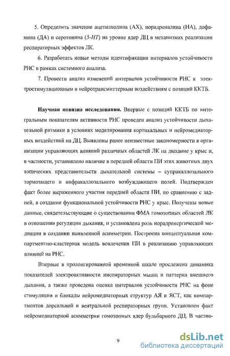3. АХ-, НА-, ДА- и 5-ЯГ-ергические механизмы, представленные в ней-росетях АЯ и ЯСТ, участвуют в регуляции и поддержании устойчивости рит мики дыхания, модулируя по тормозному и возбуждающему типу уровень активности функциональных компартментов РНС.