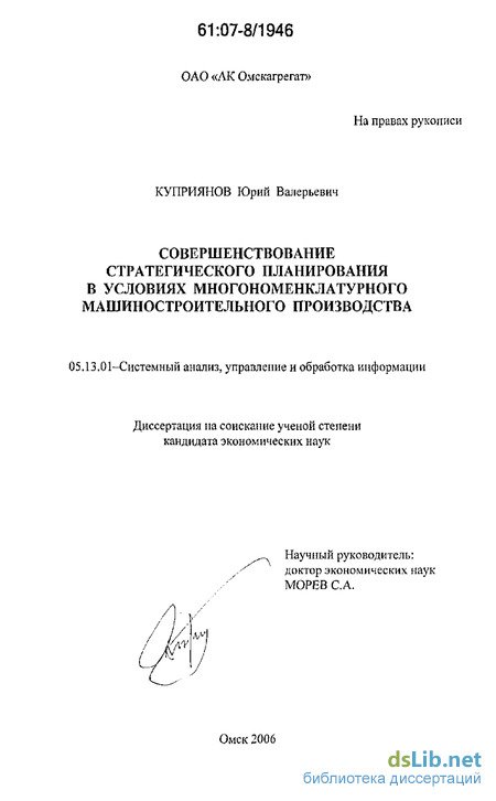 Цель и задачи исследования. Целью диссертации является теоретическая и методическая разработка основ совершенствования стратегического производственного планирования на предприятиях машиностроения.