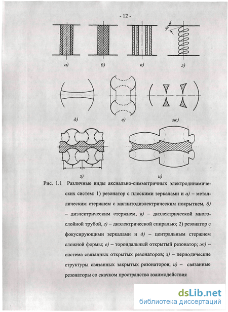 В радиофизической практике новых диапазонов широкое распространение получили устройства, обладающие осевой симметрией» (рис. 1.1) [6]. Их можно условно разделить на две большие группы. К первой относятся устройства, прообразом которых является открытый коаксиальный цилиндрический резонатор - коаксиальный волновод с неограниченным по длине центральным проводником и конечной внешней обкладкой. Простейшим представителем второй группы является открытый резонатор, состоящий из двух пластин - зеркал раз-, личной формы, расположенных на общей оси.