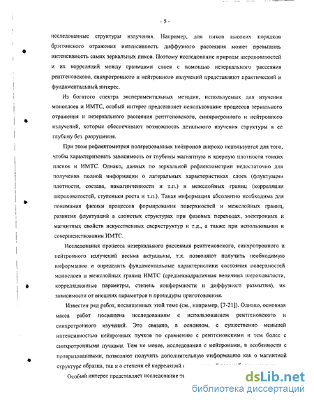 Исследования процесса незеркального рассеяния рентгеновского, синхротронного и нейтронного излучений весьма актуальны, т.к. позволяют получить необходимую информацию и определить фундаментальные характеристики состояния поверхностей монослоев и межслойных границ ИМТС (среднеквадратичная величина шероховатости, корреляционные параметры, степень конформности и диффузного размытия), их зависимости от внешних параметров и процедуры приготовления.