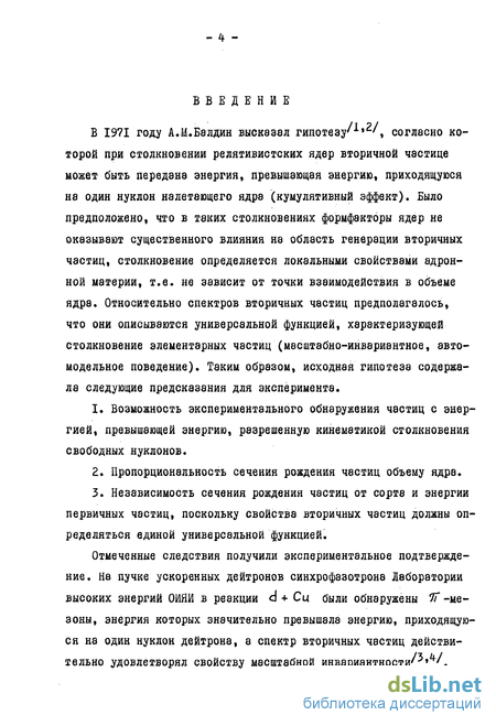 В 1971 году А.М.Балдин высказал гипотезу'1*2', согласно которой при столкновении релятивистских ядер вторичной частице может быть передана энергия, превышающая энергию, приходящуюся на один нуклон налетающего ядра (кумулятивный эффект). Было предположено, что в таких столкновениях формфакторы ядер не оказывают существенного влияния на область генерации вторичных частиц, столкновение определяется локальными свойствами адрон-ной материи, т.е. не зависит от точки взаимодействия в объеме ядра. Относительно спектров вторичных частиц предполагалось, что они описываются универсальной функцией, характеризующей столкновение элементарных частиц (мвсштабно-инвариантное, автомодельное поведение). Таким образом, исходная гипотеза содержала следующие предсказания для эксперимента.