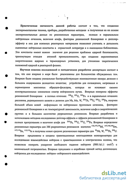 Научная новизна исследований и методических разработок диссертации состоит в том, что они впервые в мире были реализованы для большинства обсуждаемых тем. Впервые были созданы уникальные быстродействующие ионизационные камеры деления с большим содержанием делящегося вещества; устройства для охлаждения, нагревания и перемещения массивных образцов-фильтров, которые не искажают своими конструкционными элементами спектр нейтронного пучка. Впервые измерены эффекты резонансной блокировки в полных сечениях 238U, 235U, 239Ри и в парциальных сечениях рассеяния, радиационного захвата и деления для Nb, Mo, W, 232Th, 238U, 235U, 239Pu, получен большой объем новой информации по нейтронным групповым сечениям, факторам резонансной блокировки и их температурной зависимости, величине альфа в энергетических группах и в большом количестве разрешенных резонансов. Впервые разработана и использована методика исследования допплер-эффекта и эффекта резонансной блокировки в полных пропусканиях и величине альфа для 232Th, 23SU, 235U, 239Pu. Впервые определены резонансные параметры для 386 разрешенных резонансов изотопов 176-,77 179Hf, 147,I48,149Sm, 1I7 "9Sn, l,3 U5ln и получены новые средние резонансные параметры для 93Nb, W, 232Th, 238U. Впервые предложены и созданы гравитационные многощелевые монохроматоры для исследования взаимодействия нейтрона с гравитационным и электрическим полями, что позволило измерить ускорение свободного падения нейтрона (980.1±1.1 см/с) с минимальной погрешностью. Впервые предложен и опробован прямой метод догоняющих нейтронов для исследования нейтрон- нейтронного взаимодействия. На защиту диссертации выносится следующие основные положения и результаты.
