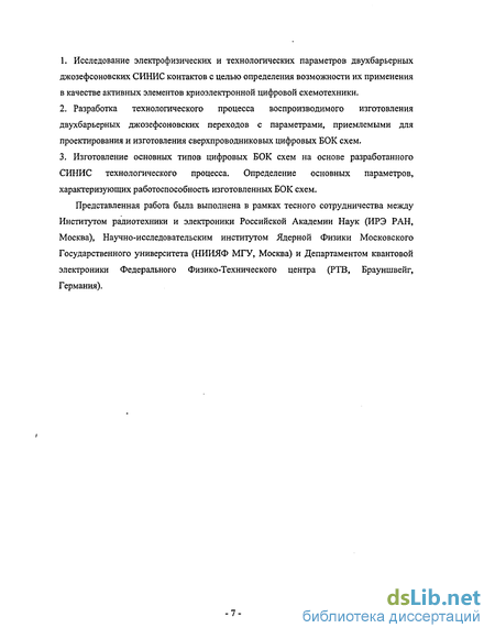 Анализируя вышесказанное, мы можем заключить, что исследование электрофизических параметров двухбарьерных джозефсоновских СИНИС структур и разработка технологического процесса для их применения в цифровых БОК схемах является одной из актуальных задач современной сверхпроводниковой электроники. Основной целью представленной работы являлось проведение комплексного исследования двухбарьерных джозефсоновских СИНИС контактов и возможности их применения в цифровой криоэлектронике на основе БОК логики. В соответствии с поставленной целью задачами работы являлись: