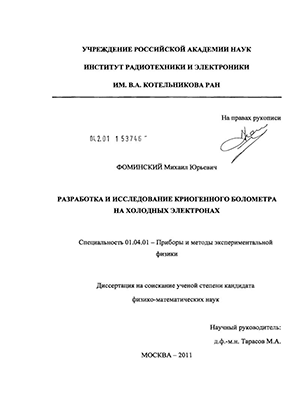 Работы были выполнены М.Ю. Фоминским в соавторстве с сотрудниками лаборатории сверхпроводниковой электроники ИРЭ им. В.А.Котельникова РАН, и Чалмерского технологического института (г.Гётеборг, Швеция). Автором разработана топология ИС БХЭ в среде AutoCAD, разработана методика изготовления и изготовлены образцы БХЭ с использованием электронной литографии методом теневого напыления через подвешенную резистивную маску, автор принимал участие в проведении измерений электрических характеристик и оптического отклика образцов БХЭ в криостате с откачкой паров НеЗ, в обработке результатов и подготовке публикаций.