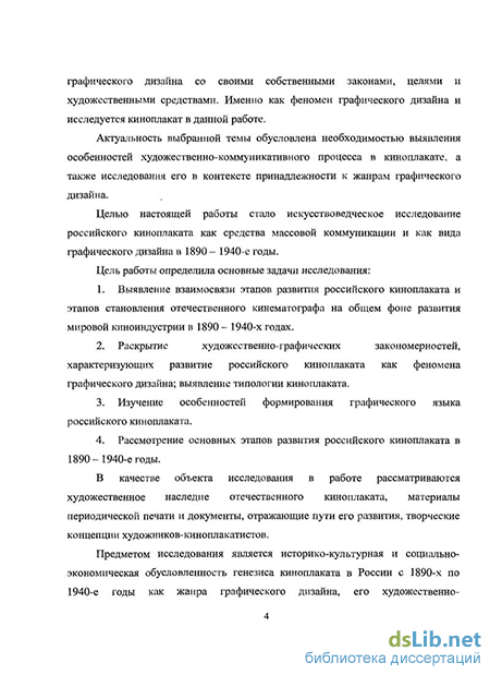 Цель и задачи исследования. Цель настоящей диссертации — искусствоведческое исследование киноплаката в России как средства массовой коммуникации и как вида графического дизайна.