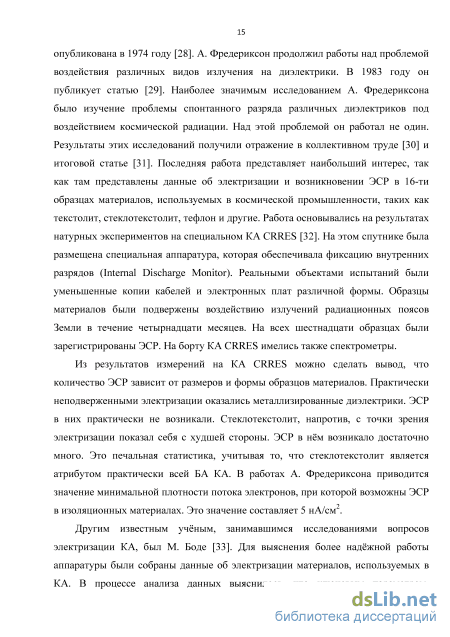 Начало полномасштабных исследований проблемы внутренней и внешней электризации КА за рубежом было положено в конце семидесятых в начале восьмидесятых годов XX века в США. Одним из первых, скорее всего он и есть первый, кому принадлежит публикация в области воздействия радиационного излучения на диэлектрики, является А. Фредериксон. Эта работа была опубликована в 1974 году [28]. А. Фредериксон продолжил работы над проблемой воздействия различных видов излучения на диэлектрики. В 1983 году он публикует статью [29]. Наиболее значимым исследованием А. Фредериксона было изучение проблемы спонтанного разряда различных диэлектриков под воздействием космической радиации. Над этой проблемой он работал не один. Результаты этих исследований получили отражение в коллективном труде [30] и итоговой статье [31]. Последняя работа представляет наибольший интерес, так как там представлены данные об электризации и возникновении ЭСР в 16-ти образцах материалов, используемых в космической промышленности, таких как текстолит, стеклотекстолит, тефлон и другие. Работа основывались на результатах натурных экспериментов на специальном КА CRRES [32]. На этом спутнике была размещена специальная аппаратура, которая обеспечивала фиксацию внутренних разрядов (Internal Discharge Monitor). Реальными объектами испытаний были уменьшенные копии кабелей и электронных плат различной формы. Образцы материалов были подвержены воздействию излучений радиационных поясов Земли в течение четырнадцати месяцев. На всех шестнадцати образцах были зарегистрированы ЭСР. На борту КА CRRES имелись также спектрометры.