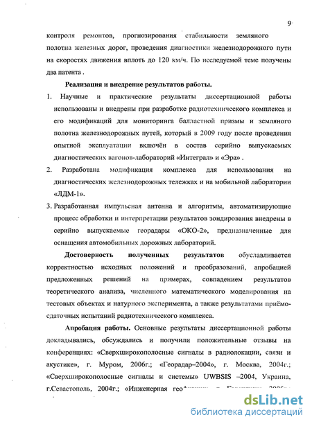 Научные и практические результаты диссертационной работы использованы и внедрены при разработке радиотехнического комплекса и его модификаций для мониторинга балластной призмы и земляного полотна железнодорожных путей, который в 2009 году после проведения опытной эксплуатации включён в состав серийно выпускаемых диагностических вагонов-лабораторий «Интеграл» и «Эра» .