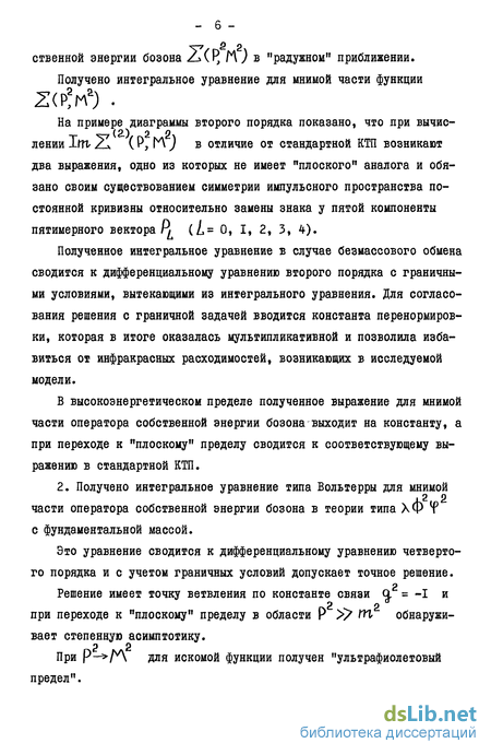 На примере диаграммы второго порядка показано, что при вычис лении величины в отличие от стандартной КТП воз никают два выражения, одно из которых не имеет "плоского" аналога и обязано своим существованием симметрии импульсного пространства постоянной кривизны относительно замены знака у пятой компоненты К пятимерного вектора Гц (/ = О, I, 2, 3, 4). Инфракрасные расходимости, возникающие в модели типаХ , можно удалить мультипликативной константой перенормировки. В высокоэнергетическом пределе, полученной выражение Тт. 2(Р,мг) выходит на константу, а в "плоском" пределе сводится к соответствующему выражению в стандартной КТП. 3. Получено решение интегрального уравнения для мнимой части оператора собственной энергии бозона в теории типа ХФ Р с фун даментальной массой. Решение имеет точку ветвления по константе связи --1 и при переходе к "плоскому" пределу в области Р » Пг обнаруживает степенную асимптотику. 4. В КТП с фундаментальной массой для исследования квантово полевых функций введена стереографическая параметризация импульс ного пространства постоянной кривизны. Координаты, вводимые с по мощью стереографического проектирования названы конформно-псевдоевклидовыми. 5. В конформно-псевдоевклидовых координатах получено точное решение интегрального уравнения для мнимой части оператора собст венной энергии бозона в "радужном" приближении с массивным обме ном (тС2 о). Найдена явная зависимость константы перенормировки упомянутого уравнения от параметров теории Q2- , уц , Щ , / \ . Исследовано поведение решения в случае больших (тС2»1ТсЛ и малых (П1сг КП?С1) значений масс обменных частиц. Показано, что учет массы обменных частиц практически не влияет на поведение искомой функции в асимптотической области а наличие фундаментальной массы И приводит к незначительному сокращению границ применимости "радужного" приближения в исследуемой модели. 6. Б стереографической проекции исследовано интегральное уравнение для мнимой части оператора собственной энергии бозона в модели с четверным взаимодействием и получено его точное решение. Показано, что средняя множественность рождения частиц при превращении Є Q -пар в адроны, в ультрафиолетовом пределе выходит на константу или имеет логарифмический рост в зависимости от группы движения Р-пространства постоянной кривизны ( S0(A2) или SO(4.1) ). 7. В "радужном" приближении теории типа Ф р исследовано интегральное уравнение для полного оператора собственной энергии бозона. Показано, что при соответствующем выборе константы перенормировки с учетом граничных условий задачи можно получить решение, мнимая часть которого не содержит инфракрасных расходимостей (при 1Псг 0) и совпадает с результатом вычисления функции Ъп21 (К2) прямым способом при помощи правил Куткосского. В асимптотической области Кг » 4 И2" в зависимости от величины отношения константы связи G- к фундаментальной массе И , реализуются условия, нарушающие положительность мнимой части оператора собственной энергии бозона. Выделены границы изменения величины Допущение Шс 4 М приводит к нарушению положительности величины 1цг Цкг) ПРИ любых значениях константы связи. 8. В безмассовой квантовой электродинамике с фундаментальной массой получено решение интегрального уравнения для вершинной функции в приближении Эдвардса. Показано, что в "пло