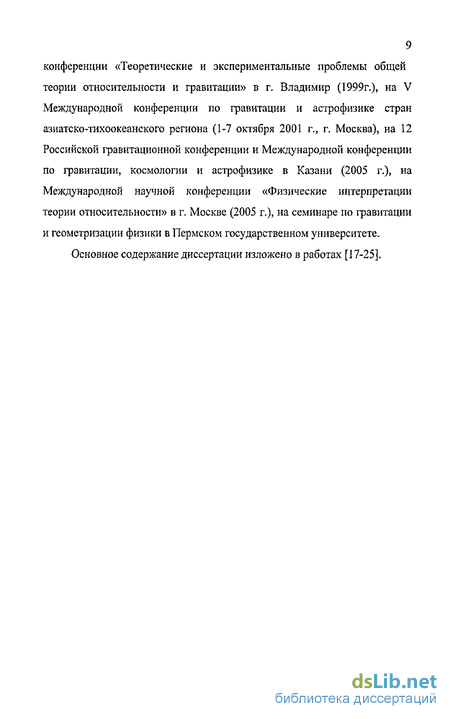 9 конференции «Теоретические и экспериментальные проблемы общей теории относительности и гравитации» в г. Владимир (1999г.), на V Международной конференции по гравитации и астрофизике стран азиатско-тихоокеанского региона (1-7 октября 2001 г., г. Москва), на 12 Российской гравитационной конференции и Международной конференции по гравитации, космологии и астрофизике в Казани (2005 г.), на Международной научной конференции «Физические интерпретации теории относительности» в г. Москве (2005 г.), на семинаре по гравитации и геометризации физики в Пермском государственном университете. Основное содержание диссертации изложено в работах [17-25].