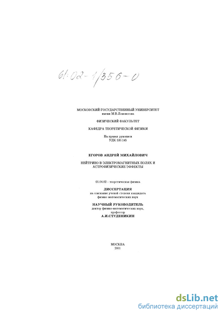 Егоров Андрей Михайлович. Нейтрино в электромагнитных полях и астрофизические эффекты : диссертация ... кандидата физико-математических наук : 01.04.02.- Москва, 2001.- 109 с.: ил. РГБ ОД, 61 02-1/356-0