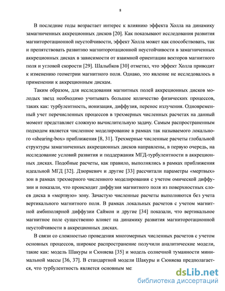 Эффективность диффузии магнитного поля определяется степенью ионизации вещества. Основные источники ионизации аккреционных дисков молодых звезд -космические лучи и рентгеновское излучение - хорошо ионизуют только поверхностные слои диска [22, 23]. Вблизи срединной плоскости диска образуется область низкой степени ионизации - так называемая «мертвая» зона, в которой омическая диффузия подавляет развитие магниторотационной неустойчивости [22]. Магнитная амбиполярная диффузия приводит к дополнительному увеличению размеров «мертвых» зон [24]. Параметры пыли [25, 26], содержание металлов в газовой фазе [27, 28] существенно влияют на степень ионизации и на параметры «мертвых» зон. В последние годы возрастает интерес к влиянию эффекта Холла на динамику замагниченных аккреционных дисков [20]. Как показывают исследования развития магниторотационной неустойчивости, эффект Холла может как способствовать, так и препятствовать развитию магниторотационной неустойчивости в замагниченных аккреционных дисках в зависимости от взаимной ориентации векторов магнитного поля и угловой скорости [29]. Шалыбков [30] отметил, что эффект Холла приводит к изменению геометрии магнитного поля. Однако, это явление не исследовалось в применении к аккреционным дискам.