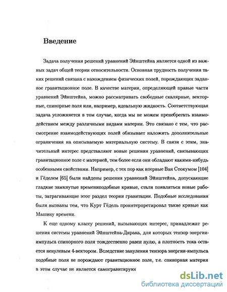 В диссертации изучаются спинорные духи, т.е. спинорные поля, тензор энергии-импульса которых равен нулю, а плотность тока тождественно в нуль не обращается. Впервые такие решения исследовались в [3,8,11]. В [8] рассматривался целый класс решений уравнений Эйнштейна, отвечающих спинорному полю нулевой массы и связанных условием Та = 0. Показано, что для подобных решений уравнений Эйнштейна возможны только пространства типов D или N по классификации Петрова. Впоследствии было получены новые решения уравнений Эйнштейна-Дирака, являющиеся нейтринными духами (масса спинорного поля равна нулю) [1,4-6,12]. В [1,12] показано, что нейтринные духи могут существовать и в плоском пространстве-времени. В [10] получены решения уравнений Эйнштейна-Дирака-Максвелла (пренебрегалось взаимодействием электромагнитного и спинорного поля), также являющиеся нейтринными духами. В этом случае уравнения Эйнштейна не эквивалентны вакуумным, т.к. тензор энергии-импульса электромагнитного поля не равен нулю. В [2] рассматривались уравнения Эйнштейна-Дирака-Клейна-Фока с невзаимодействующими скалярным и спинорным полями. Были также получены нейтринные духи; при этом тензор энергии-импульса полученного скалярного поля тождественно нулю не равен.