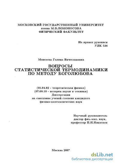 Моисеева Галина Вячеславовна. Вопросы статистической термодинамики по методу Боголюбова : диссертация ... кандидата физико-математических наук : 01.04.02, 07.00.10.- Москва, 2002.- 128 с.: ил. РГБ ОД, 61 03-1/572-8