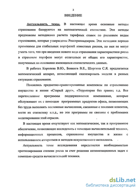 Актуальность темы. В настоящее время основные методы страхования взяты из математической статистики, предложенные методиками расчета тарифных ставок по рисковым видам страхования, утвержденными Росстрахнадзором. Эти методики хорошо применимы для стабильных портфелей известных рисков, но они не могут учесть того, что при введении нового вида страхования характеристики риска в страховом портфеле могут отличаться от общих его характеристик, полученных на основании имеющихся статистических данных.