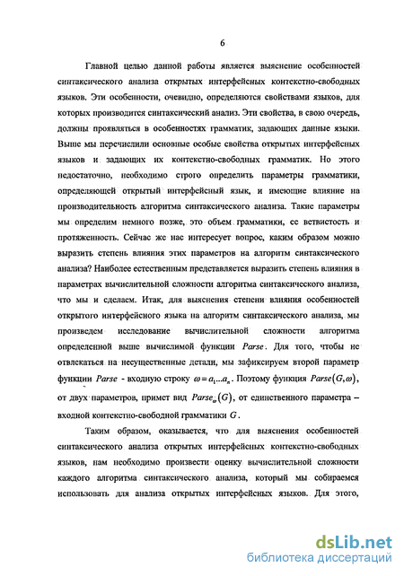 Главной целью данной работы является выяснение особенностей синтаксического анализа открытых интерфейсных контекстно-свободных языков. Эти особенности, очевидно, определяются свойствами языков, для которых производится синтаксический анализ. Эти свойства, в свою очередь, должны проявляться в особенностях грамматик, задающих данные языки. Выше были перечислены основные особые свойства таких грамматик. Но этого недостаточно, необходимо строго определить параметры грамматики, определяющей открытый интерфейсный язык, имеющие влияние на производительность алгоритма синтаксического анализа. Такие параметры будут определены немного позже: это объем грамматики, ее ветвистость и протяженность. Сейчас же нас интересует вопрос, каким образом можно выразить степень влияния этих параметров на алгоритм синтаксического анализа? Наиболее естественным представляется выразить степень влияния в параметрах вычислительной сложности алгоритма синтаксического анализа, что и сделано в настоящей работе. Для выяснения степени влияния особенностей открытого интерфейсного языка на алгоритм синтаксического анализа проведено исследование вычислительной сложности алгоритма определенной выше вычислимой функции Parse. Для того, чтобы не отвлекаться на несущественные детали, мы зафиксируем второй параметр функции Parse - входную строку т = в,...в,. Поэтому функция Parse{G,a) от двух параметров примет вид Parsea (G) от единственного параметра - входной контекстно-свободной грамматики G.