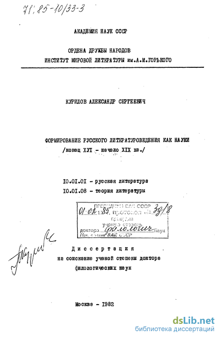 Курилов Александр Сергеевич. Формирование русского литературоведения как науки (конец XVI - начало XIX вв.) : ил РГБ ОД 71:85-10/33