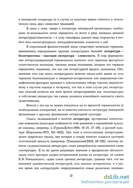 При определении места пионерской литературы в кругу литературных явлений ее следует соотносить и с таким понятием, как массовая литература ([ГудковДубинСтрада:1998, 48-55], [ГудковДубин:1994 69-77], [Чер-няк:2005]). Во многом это понятие включает в себя конституирующие признаки беллетристики: «Обычные оценки, практикуемые в нормальном литературоведении, определяют массовую (она же —низовая, тривиальная, банальная, макулатурная, развлекательная, популярная, китчевая и т.д.) литературу как стандартизованную, формульную, клишированную, подчеркивая тем самым примитивность ее конструктивных принципов и экспрессивных произведений» [ГудковДубин:1994, 70]. Содержание массовой литературы определяется аналогично беллетристическому: «Массовые повествования строятся на принципе жизнеподобия, рудиментах реалистического описания, «миметического письма». В них социально характерные герои действуют в узнаваемых социальных ситуациях и типовой обстановке, сталкиваясь с проблемами и трудностями, знакомыми и насущными для большинства читателей» [ГудковДубинСтрада:1998, 49-50]. Содержание пионерской литературы сопоставимо с содержанием массовой литературы: это сюжеты из пионерской повседневности, современной читателю или относящейся к недалекому прошлому; это литература о сегодняшнем и вчерашнем дне пионерской организации. Исследователи массовой литературы указывают на типологическую общность таких явлений, как «массовая литература» и «детская литература», и, в частности, утверждают, что «конститутивные для высокой литературы принципы «оригинальности» и т.п. в данных формах недействительны: образец может адаптироваться или пересказываться (а иногда даже переводиться) под именем другого автора, что свидетельствует о незначимости авторского права и тех универсалистских ориентации, которые стоят за ним (ср., например, русскоязычные варианты «Трех поросят», «Буратино», рома-