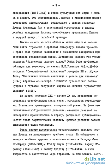 Развитие египетской поэзии второй половины XIX - начала XX вв. не получало до недавнего времени должной историко-литературной интерпретации. В этой связи большое значение приобретает статья А.Б.Куделина "О путях развития новой арабской поэзии" /32/, рассматривающая сложные процессы перестройки поэзии в странах Арабского востока в узловых моментах ее эволюции. Настоящее исследование в известной степени отталкивается в исходных позициях от данной статьи.
