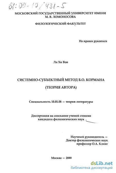 Методологической основой диссертации явились труды М.М. Бахтина, В.В. Виноградова, Л.Я. Гинзбург, М.М. Гиршмана, Г.А. Гуковского, В.Д. Днепрова, Я.О. Зунделовича, Д.С. Лихачева, Ю.М. Лотмана, Г.Н. Поспелова, В.Д. Сквозникова, Б.В. Томашевского, Ю.Н. Тынянова и др., а также С.С. Аверинцева, М.Л. Андреева, Д.П. Бака, Н.К. Бонецкой, С.Н. Бройтмана, М.Л. Гаспарова, П.А. Гринцера, И.М. Дубровиной, Б.Ф. Егорова, В.Б. Катаева, О.А. Клинга, П.А. Николаева, Е.И. Орловой, В.В. Прозорова, И.Б. Роднянской, Е.Г. Рудневой, Т.И. Сильман, Н.Д. Тамарченко, В.И. Тюпы, Б.А. Успенского, Л.В. Чернец, В.Е. Хализева, А.Я. Эсалнек. Особое внимание уделено специальным исследованиям по теории литературы, в частности, по проблеме автора, а также лирического героя, литературного рода и жанра и др. Важными являются подходы к проблеме автора не только русского, но и мирового литературоведения (Р. Барт, М. Фуко, Ц. Тодоров, М. Фрайзе и др.). Наконец, наиважнейшими являются теоретические работы самого Б.О. Кормана, его учеников (Т.Л. Власенко, A.M. Гаркави, Е.Г. Мущенко, В.А Свительского, В.И. Чулкова, Д. Черашней).