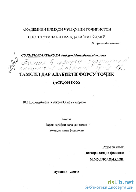 Сохибназарбекова Райхон Мамадаминбековна. Тамсил в персидско-таджикской классической литературе IX-X вв. : диссертация ... кандидата филологических наук : 10.01.06.- Душанбе, 2000.- 160 с.: ил. РГБ ОД, 61 01-10/717-1